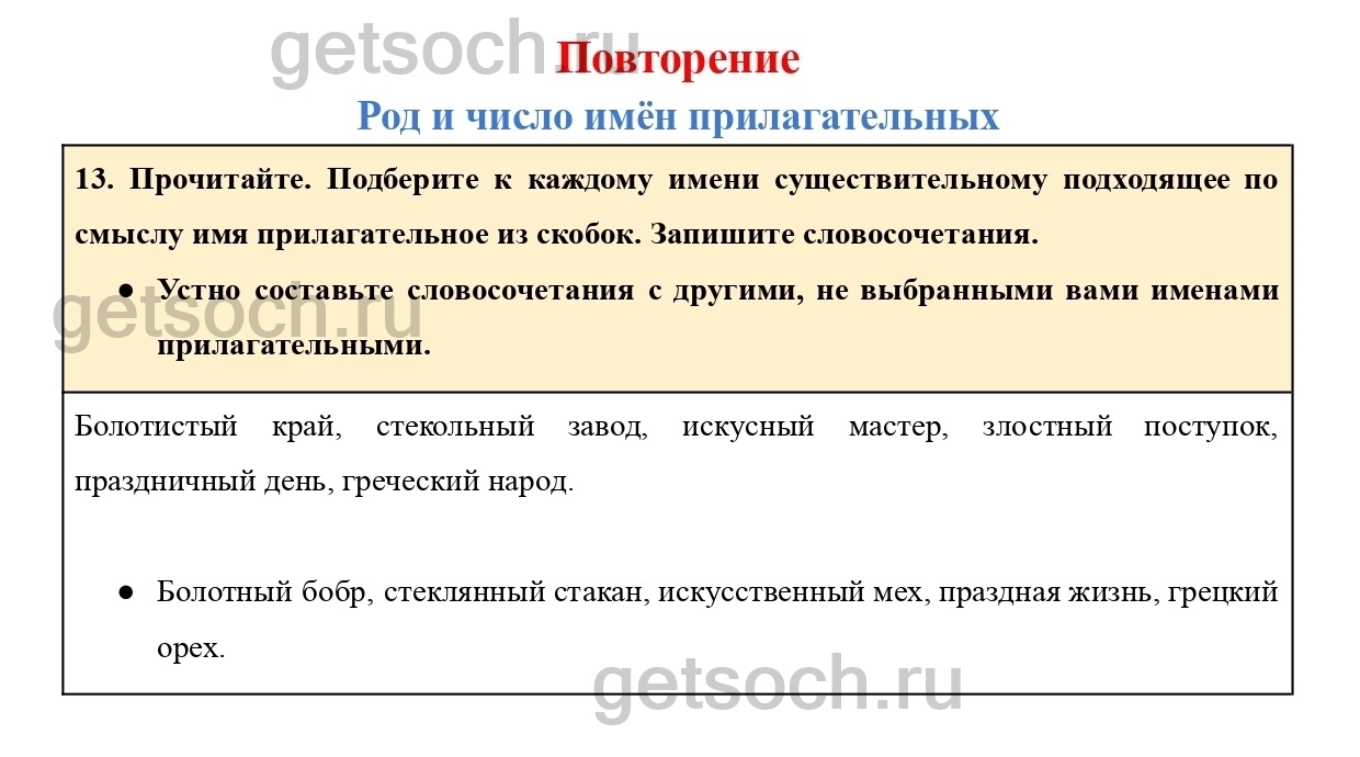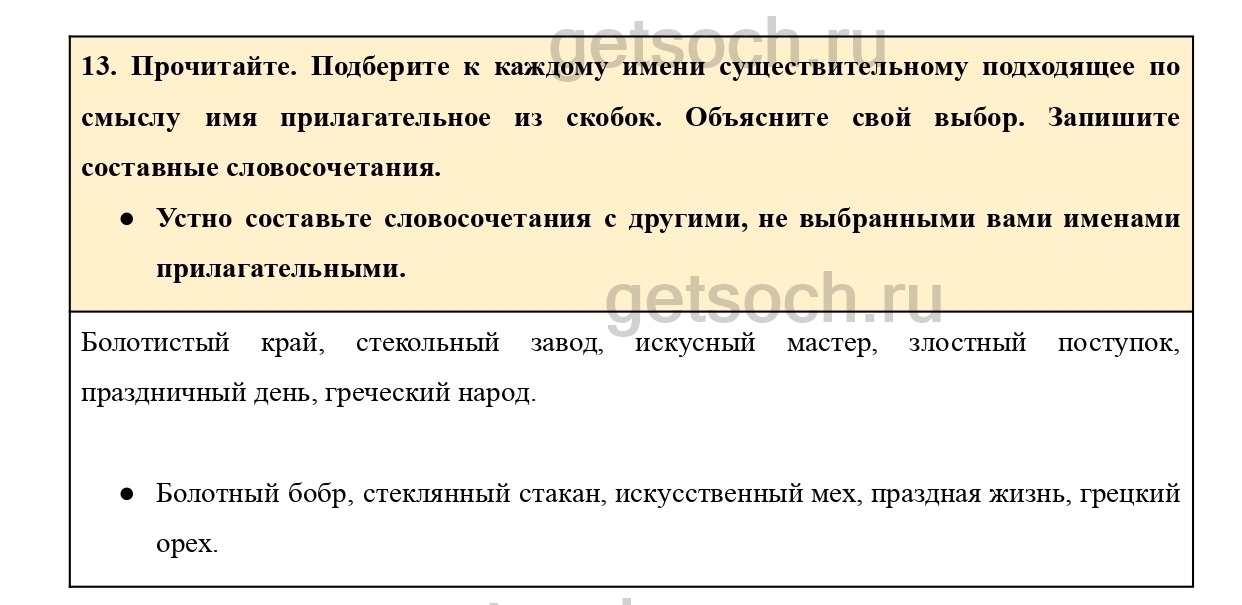 13. Прочитайте. Подберите к каждому имени существительному подходящее по смыслу имя прилагательное из скобок. Запишите словосочетания.