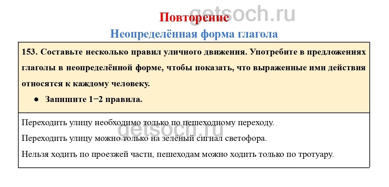 153. Составьте несколько правил уличного движения. Употребите в предложениях глаголы в неопределённой форме, чтобы показать, что выраженные ими действия относятся к каждому человеку.