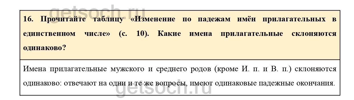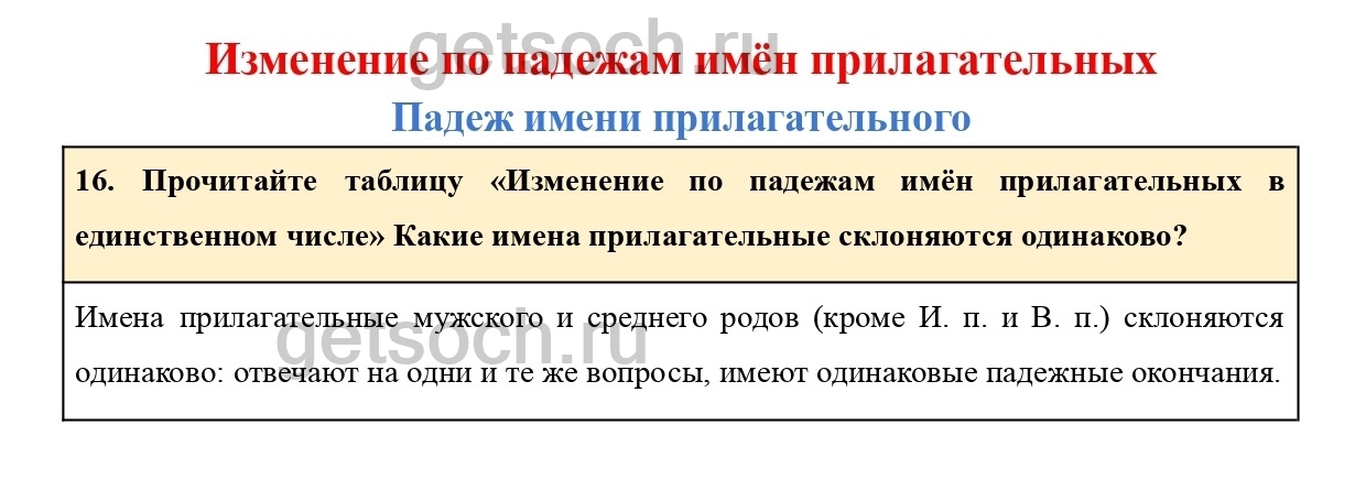 16. Прочитайте таблицу «Изменение по падежам имён прилагательных в единственном числе» Какие имена прилагательные склоняются одинаково?