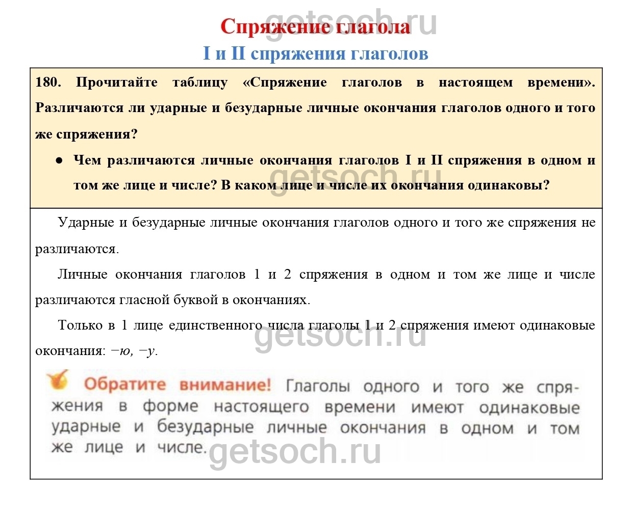 180. Прочитайте таблицу «Спряжение глаголов в настоящем времени». Различаются ли ударные и безударные личные окончания глаголов одного и того же спряжения?