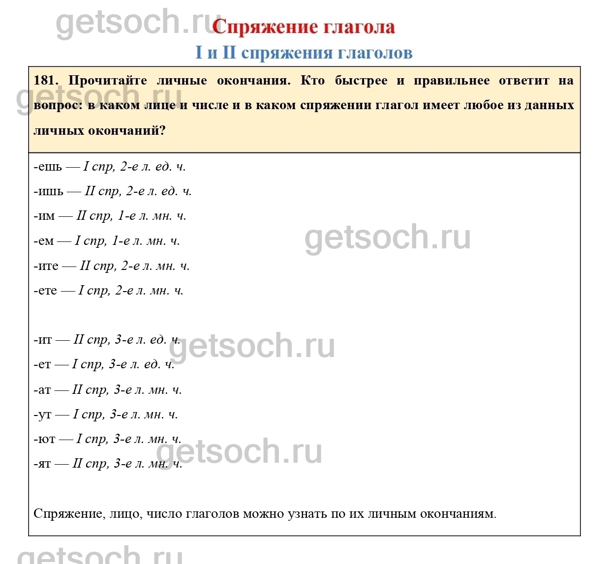 181. Прочитайте личные окончания. Кто быстрее и правильнее ответит на вопрос: в каком лице и числе и в каком спряжении глагол имеет любое из данных личных окончаний?