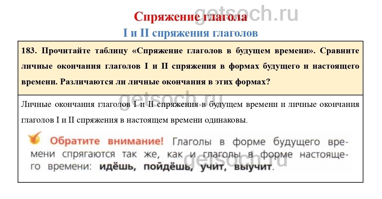 183. Прочитайте таблицу «Спряжение глаголов в будущем времени». Сравните личные окончания глаголов I и II спряжения в формах будущего и настоящего времени. Различаются ли личные окончания в этих формах?