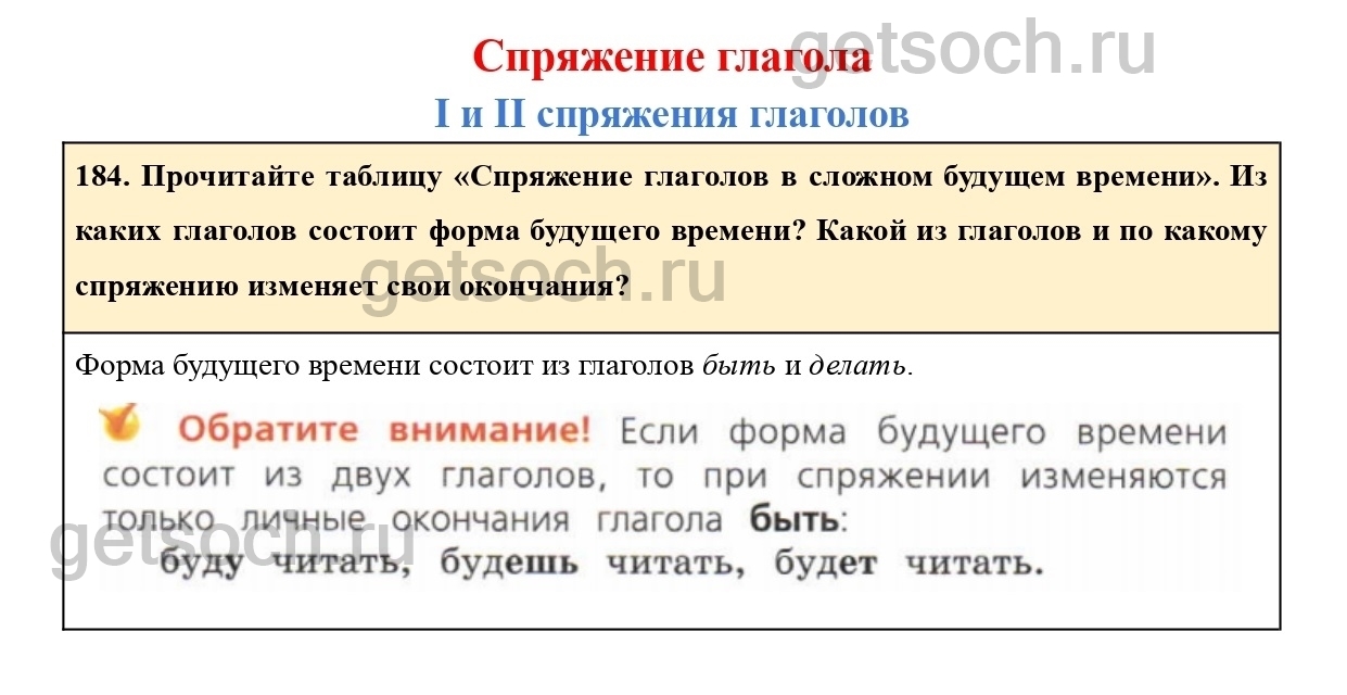 184. Прочитайте таблицу «Спряжение глаголов в сложном будущем времени». Из каких глаголов состоит форма будущего времени? Какой из глаголов и по какому спряжению изменяет свои окончания?