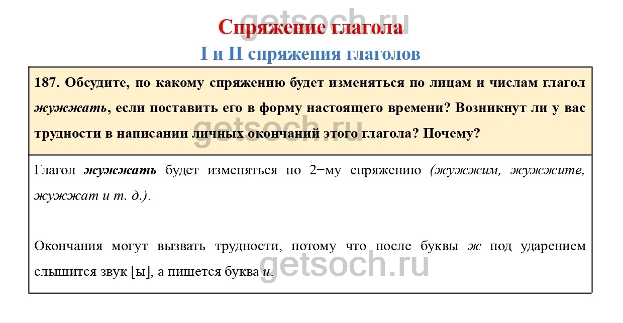 187. Обсудите, по какому спряжению будет изменяться по лицам и числам глагол жужжать, если поставить его в форму настоящего времени? Возникнут ли у вас трудности в написании личных окончаний этого глагола? Почему?