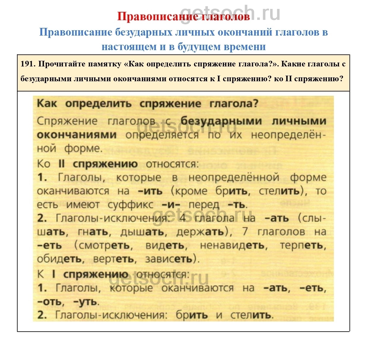 191. Прочитайте памятку «Как определить спряжение глагола?». Какие глаголы с безударными личными окончаниями относятся к I спряжению? ко II спряжению?