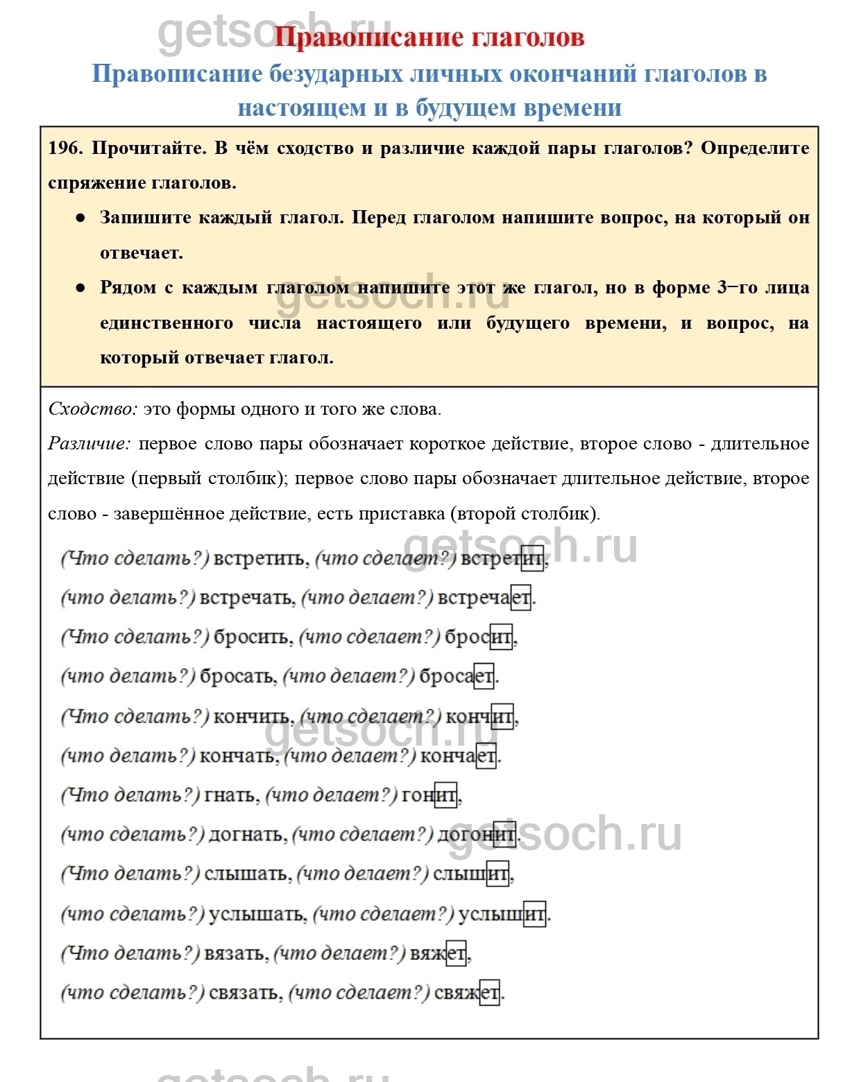 196. Прочитайте. В чём сходство и различие каждой пары глаголов? Определите спряжение глаголов.