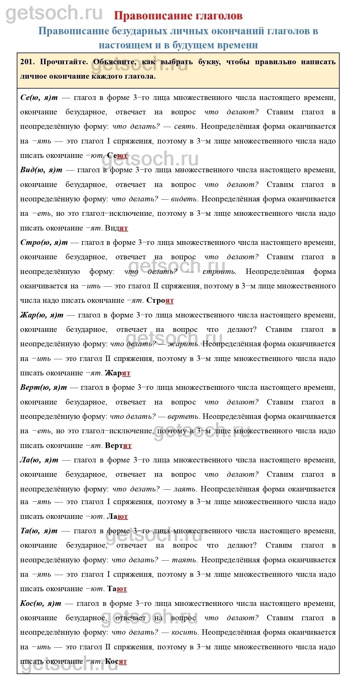 201. Прочитайте. Объясните, как выбрать букву, чтобы правильно написать личное окончание каждого глагола.