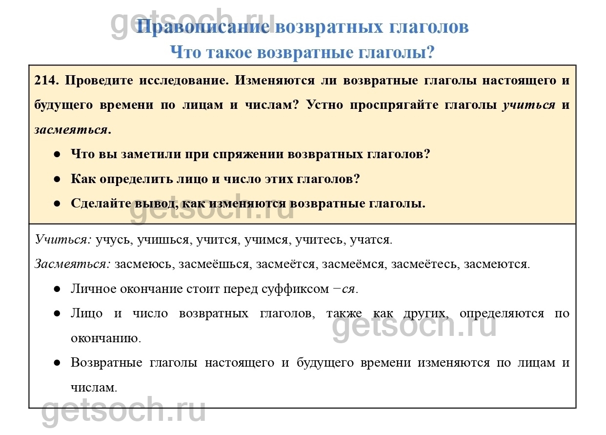 214. Проведите исследование. Изменяются ли возвратные глаголы настоящего и будущего времени по лицам и числам? Устно проспрягайте глаголы учиться и засмеяться.