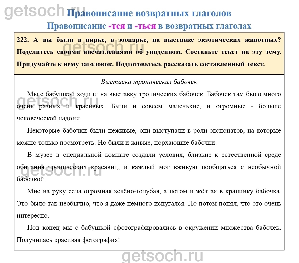 222. А вы были в цирке, в зоопарке, на выставке экзотических животных? Поделитесь своими впечатлениями об увиденном. Составьте текст на эту тему. Придумайте к нему заголовок. Подготовьтесь рассказать составленный текст.