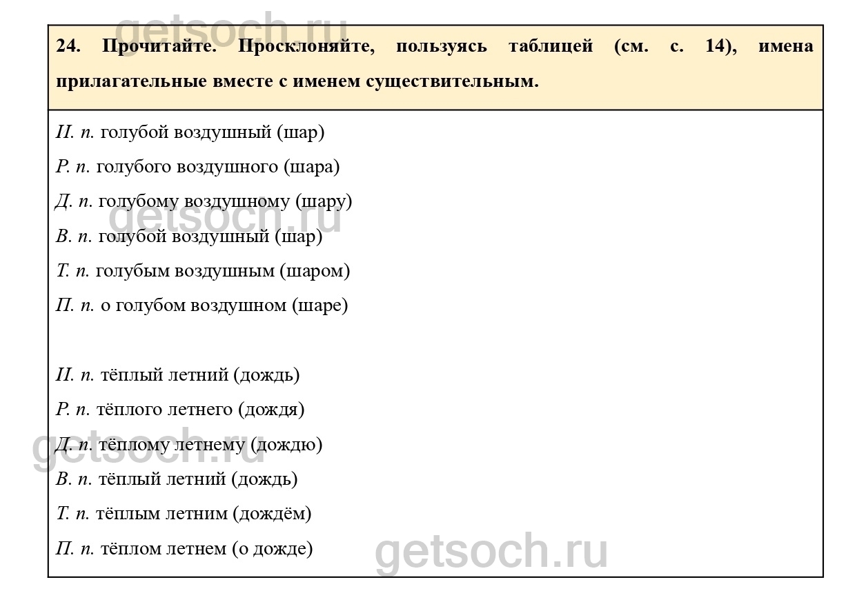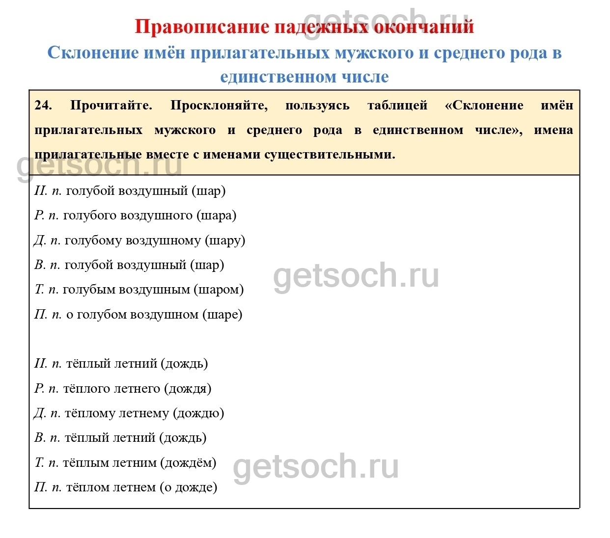 24. Прочитайте. Просклоняйте, пользуясь таблицей «Склонение имён прилагательных мужского и среднего рода в единственном числе», имена прилагательные вместе с именами существительными.