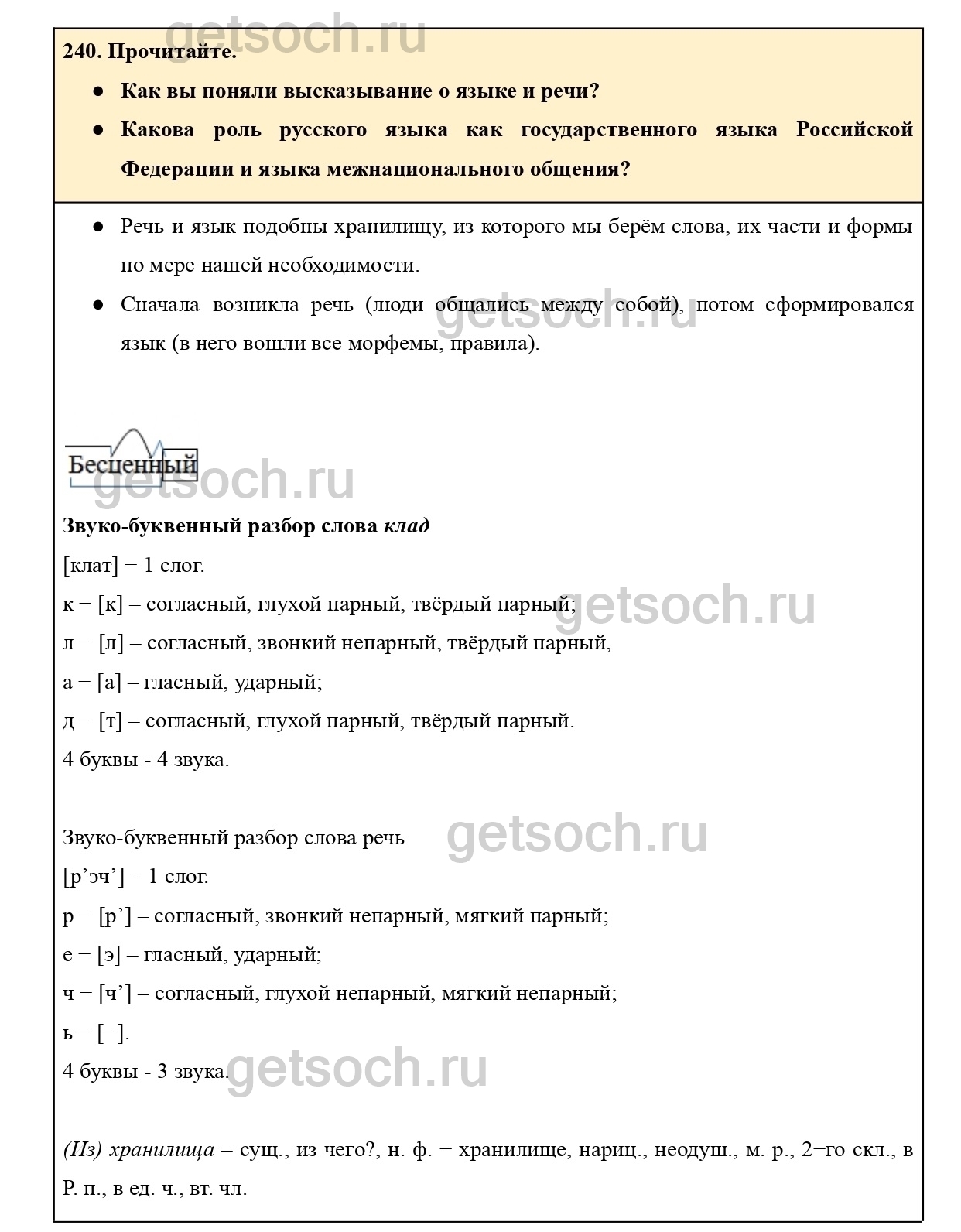Рассмотрим ответы на Упражнение 240 из учебника по русскому языку для 4 класса Канакиной