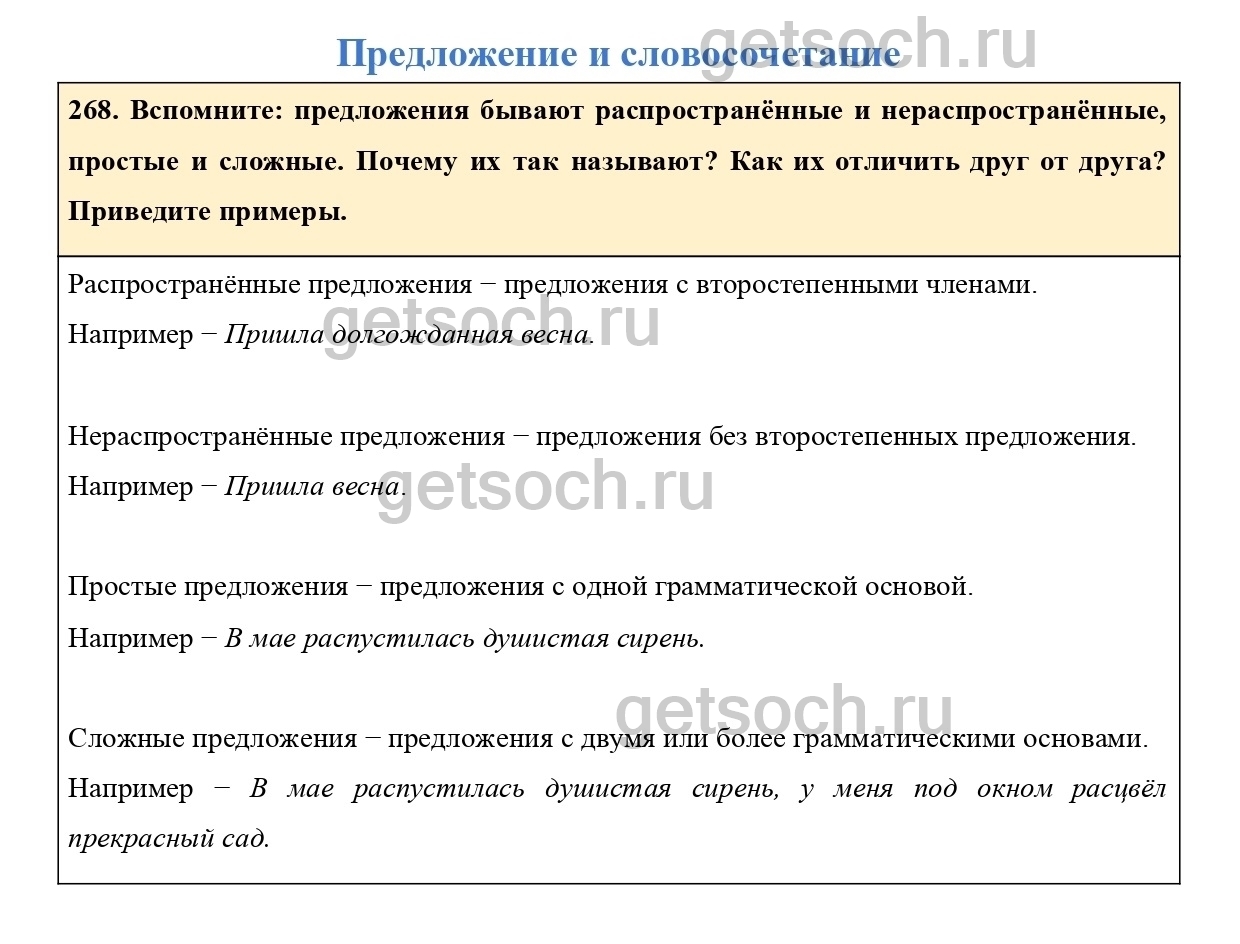 268. Вспомните: предложения бывают распространённые и нераспространённые, простые и сложные. Почему их так называют? Как их отличить друг от друга? Приведите примеры.