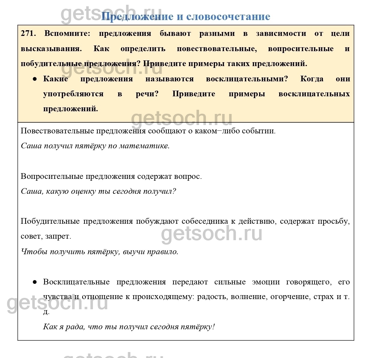 271. Вспомните: предложения бывают разными в зависимости от цели высказывания. Как определить повествовательные, вопросительные и побудительные предложения? Приведите примеры таких предложений.