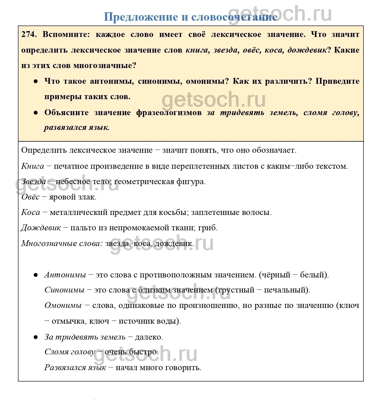 274. Вспомните: каждое слово имеет своё лексическое значение. Что значит определить лексическое значение слов книга, звезда, овёс, коса, дождевик? Какие из этих слов многозначные?