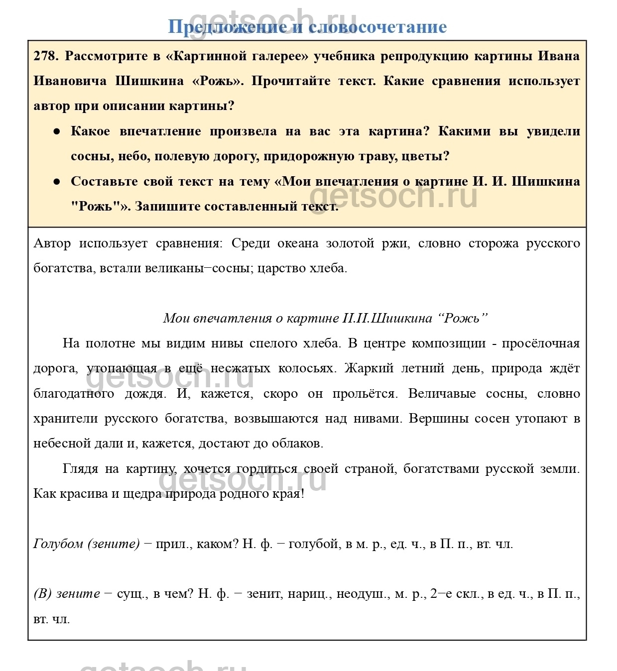 278. Рассмотрите в «Картинной галерее» учебника репродукцию картины Ивана Ивановича Шишкина «Рожь». Прочитайте текст. Какие сравнения использует автор при описании картины?