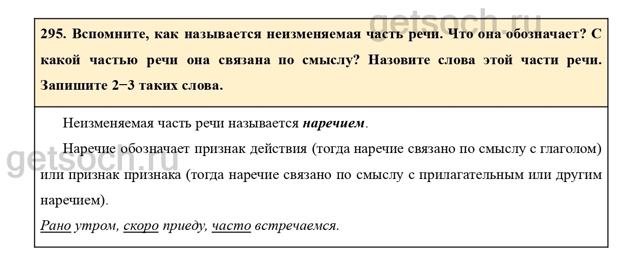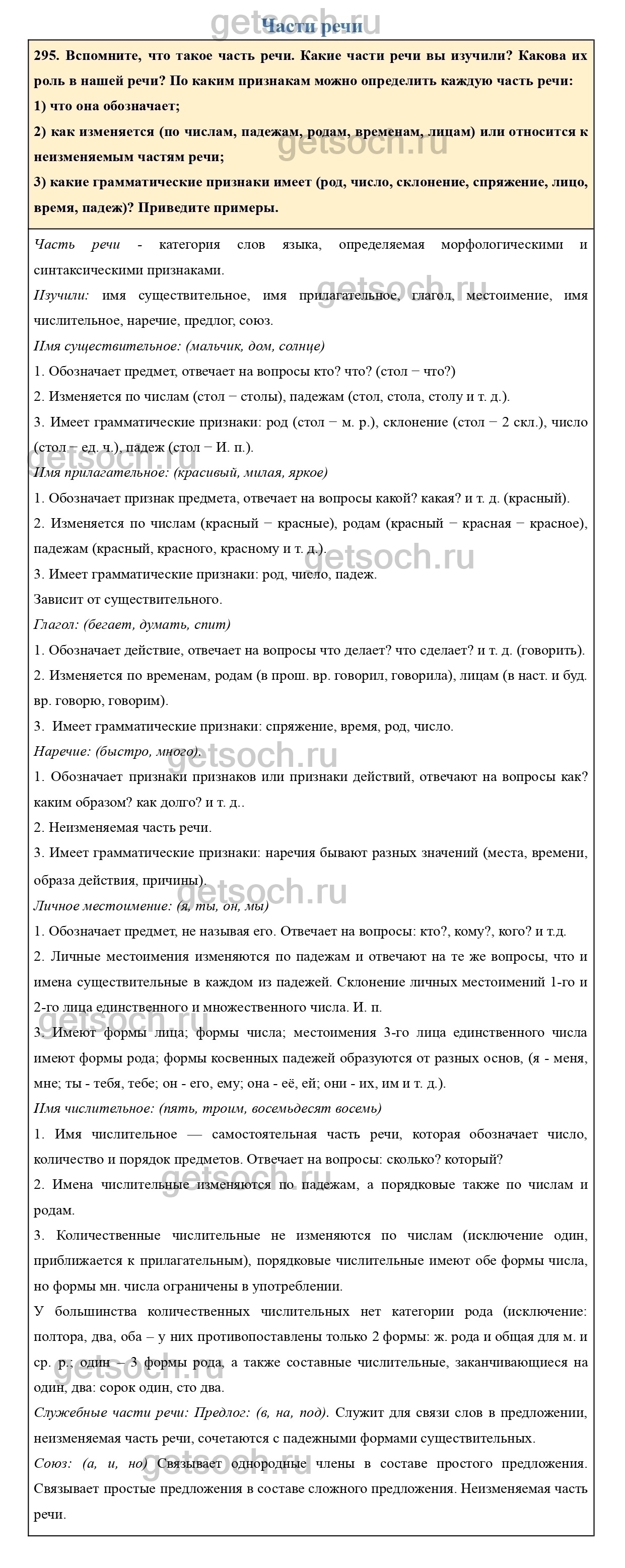 295. Вспомните, что такое часть речи. Какие части речи вы изучили? Какова их роль в нашей речи? По каким признакам можно определить каждую часть речи: