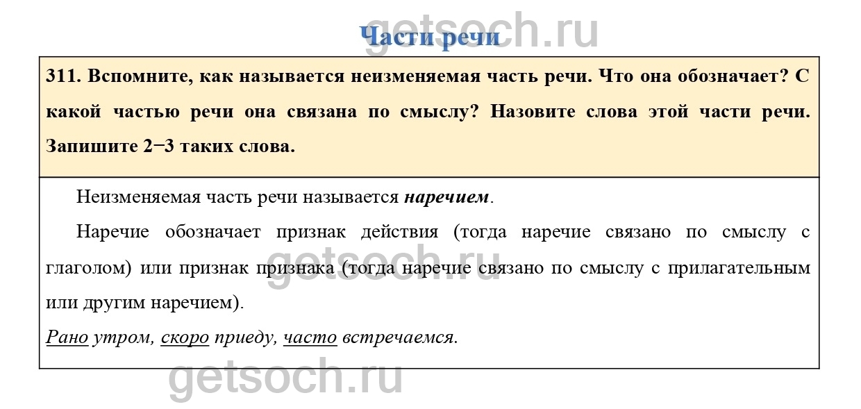 311. Вспомните, как называется неизменяемая часть речи. Что она обозначает? С какой частью речи она связана по смыслу? Назовите слова этой части речи. Запишите 2−3 таких слова.