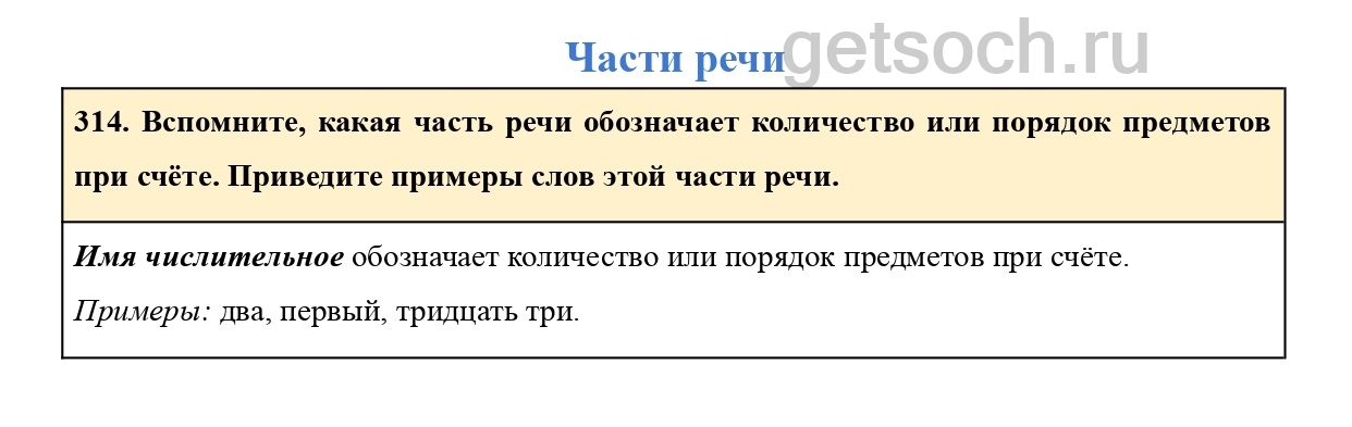 314. Вспомните, какая часть речи обозначает количество или порядок предметов при счёте. Приведите примеры слов этой части речи.