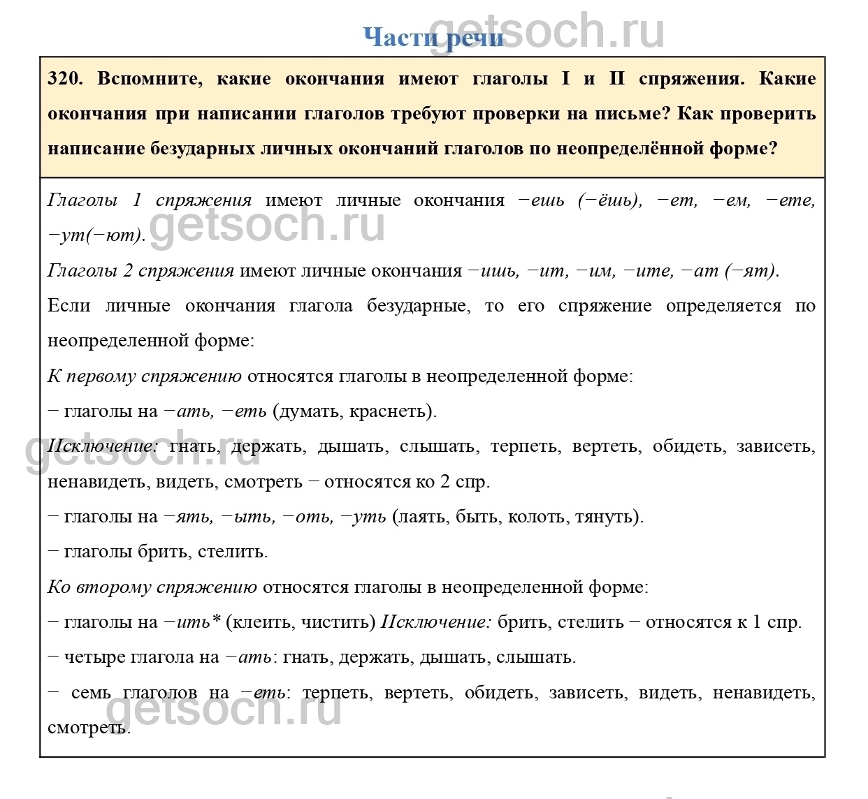 320. Вспомните, какие окончания имеют глаголы I и II спряжения. Какие окончания при написании глаголов требуют проверки на письме? Как проверить написание безударных личных окончаний глаголов по неопределённой форме?