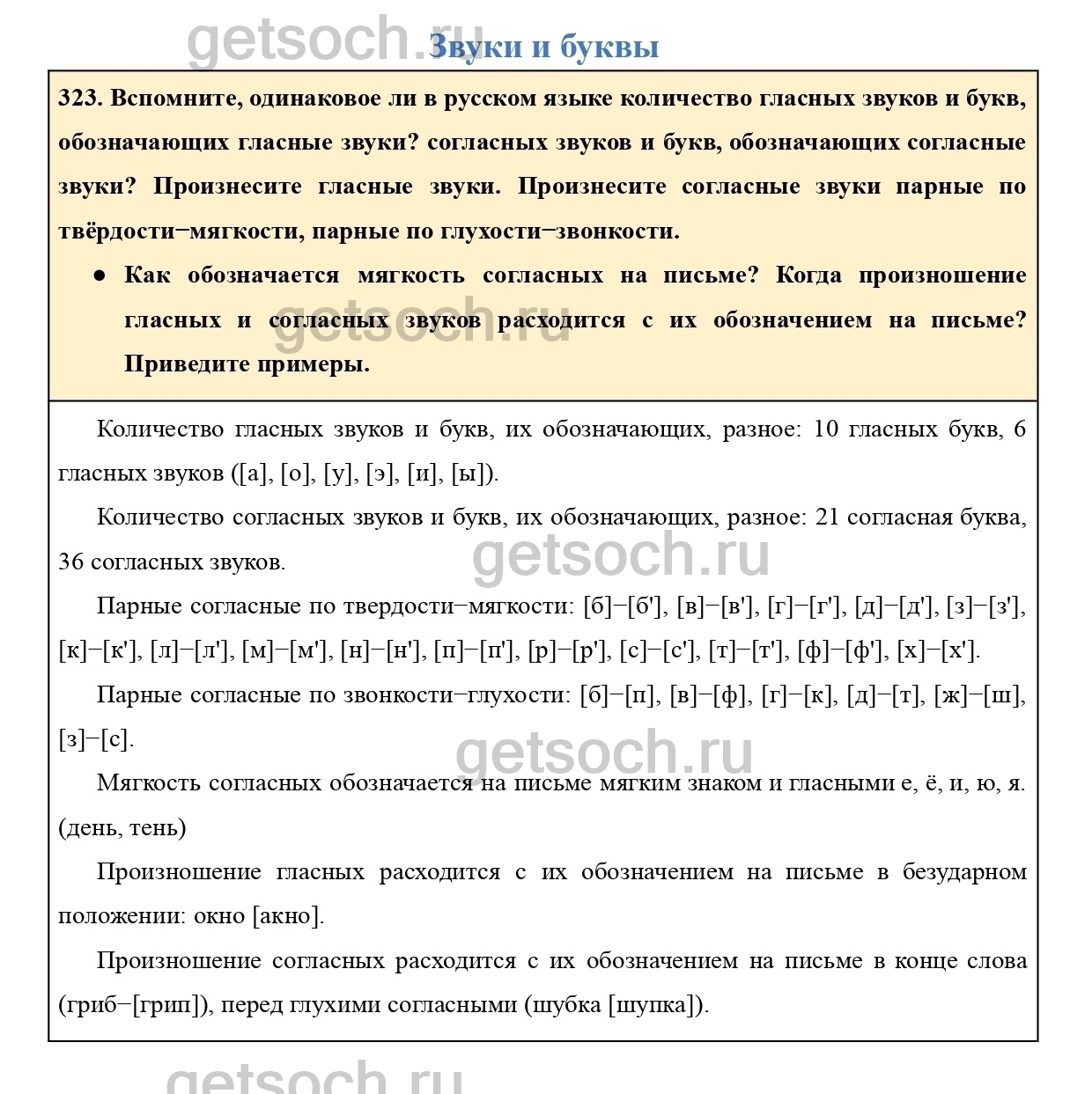 323. Вспомните, одинаковое ли в русском языке количество гласных звуков и букв, обозначающих гласные звуки? согласных звуков и букв, обозначающих согласные звуки? Произнесите гласные звуки. Произнесите согласные звуки парные по твёрдости−мягкости, парные по глухости−звонкости.
