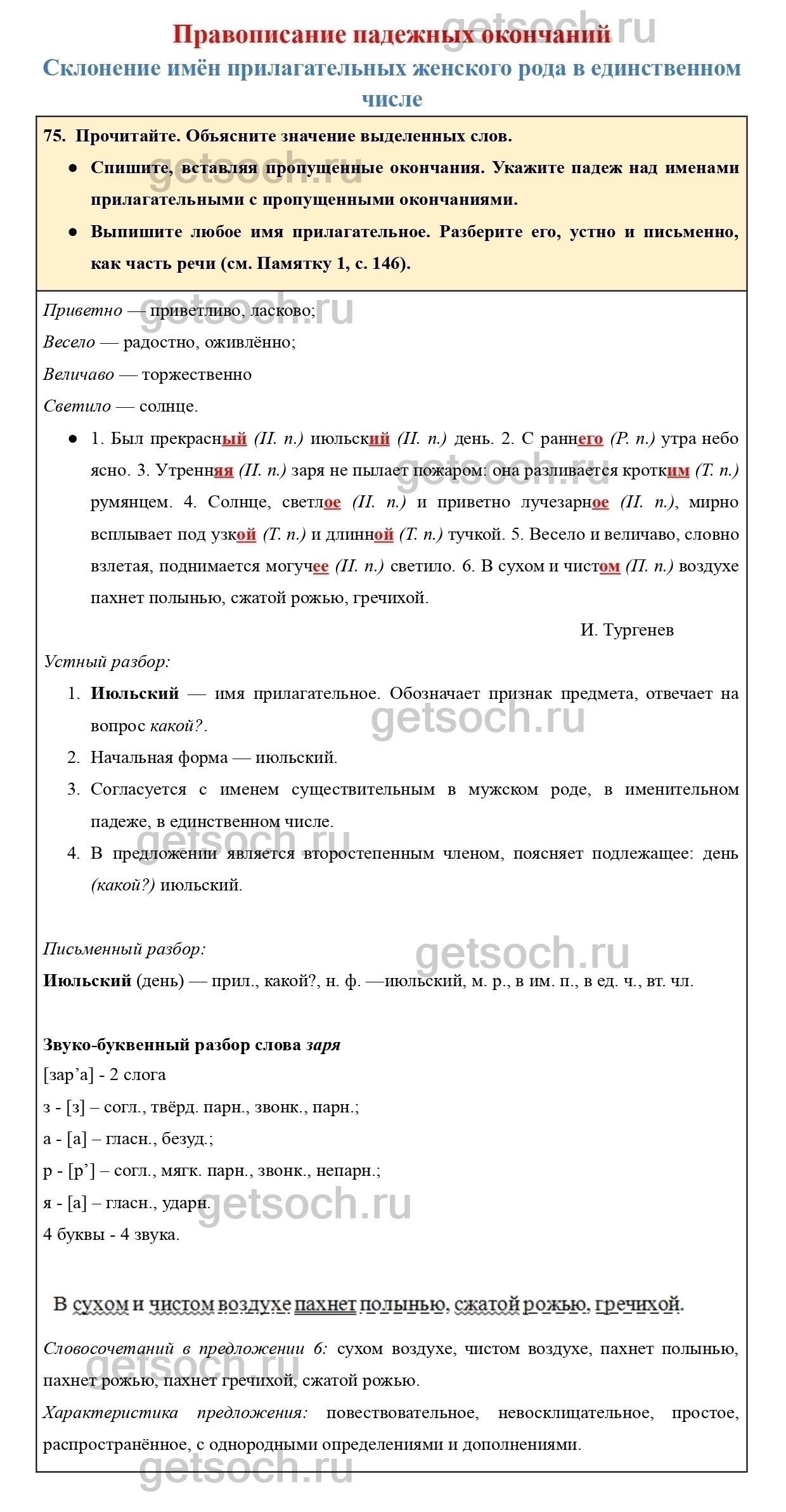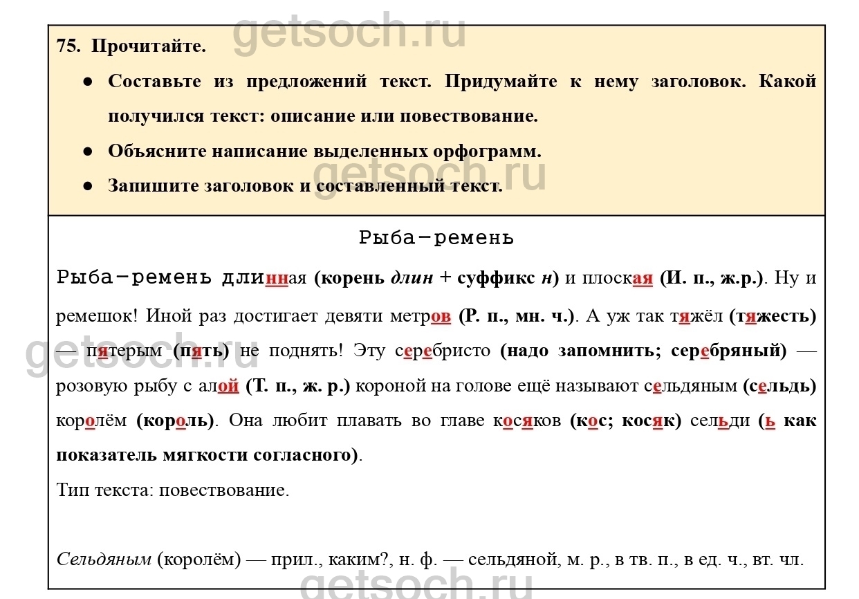 Рассмотрим ответы на Упражнение 75 из учебника по русскому языку для 4 класса Канакиной
