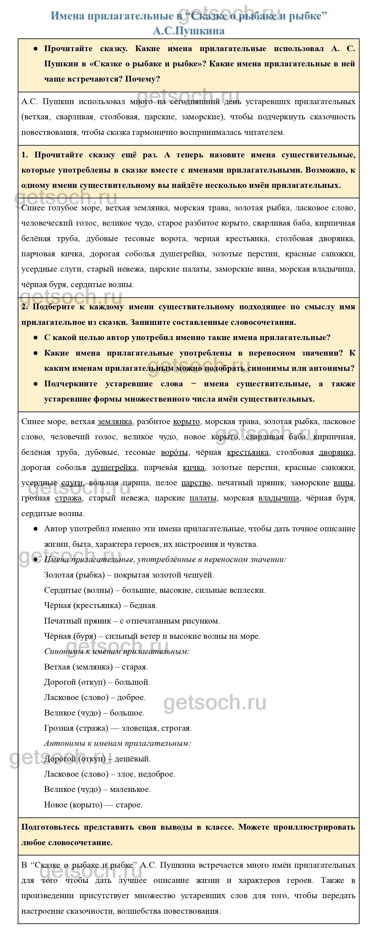 Прочитайте сказку. Какие имена прилагательные использовал А. С. Пушкин в «Сказке о рыбаке и рыбке»? Какие имена прилагательные в ней чаще встречаются? Почему?