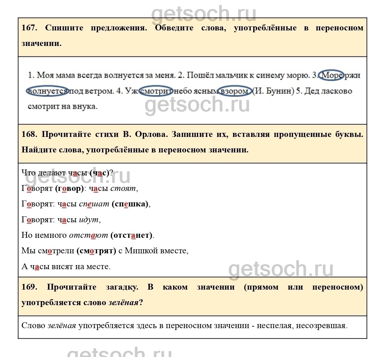 167. Спишите предложения. Обведите слова, употреблённые в переносном значении.