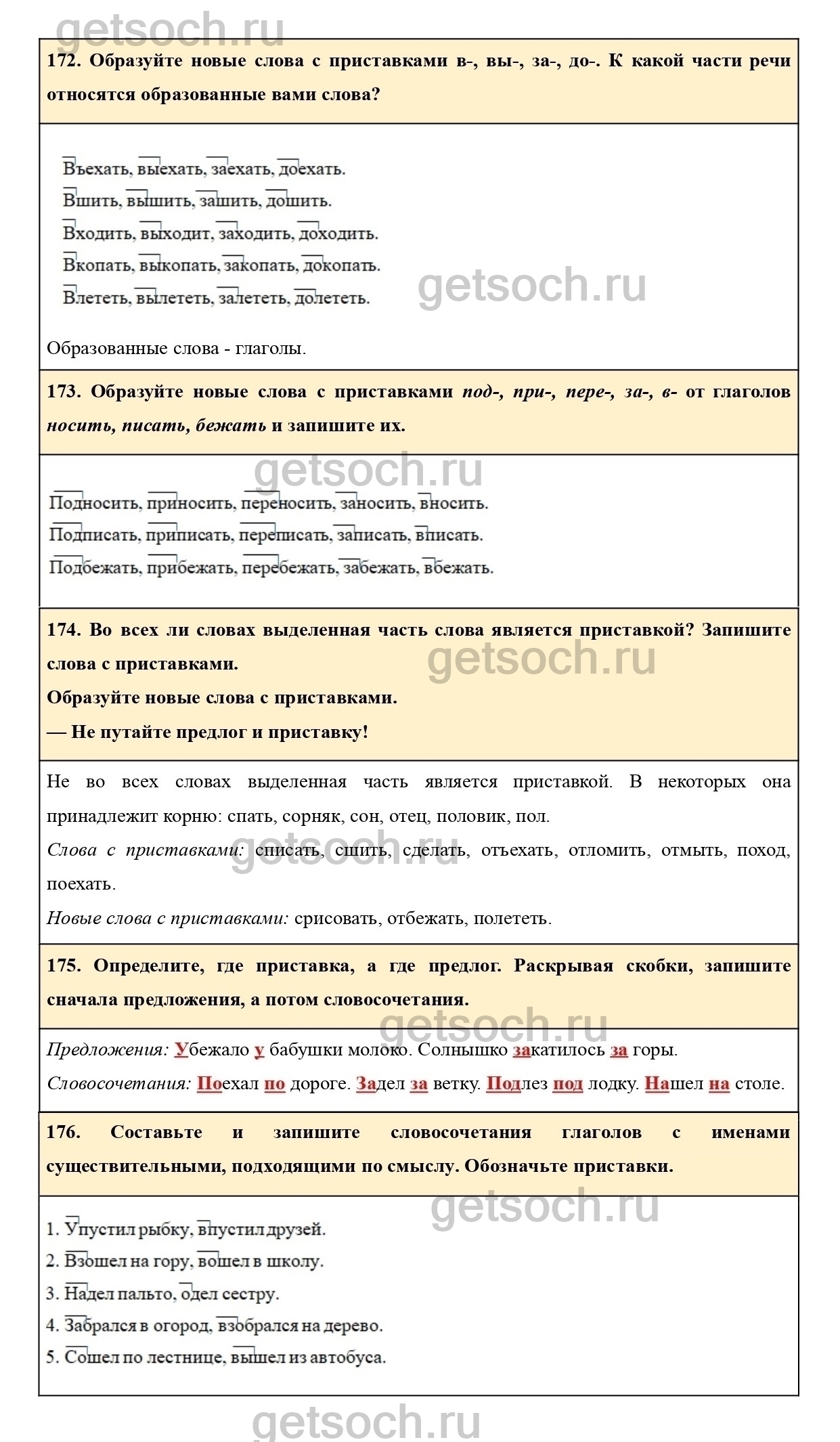 176. Составьте и запишите словосочетания глаголов с именами существительными, подходящими по смыслу. Обозначьте приставки.