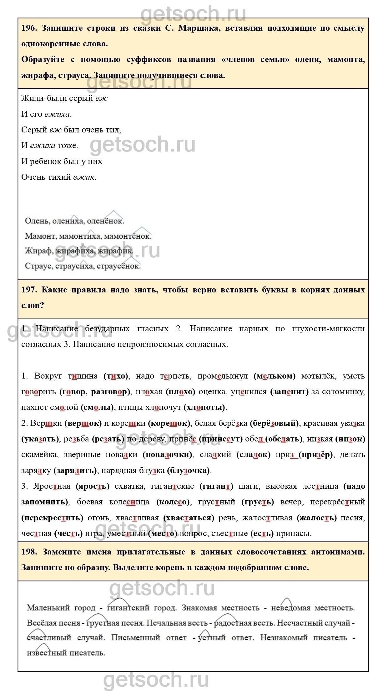 196. Запишите строки из сказки С. Маршака, вставляя подходящие по смыслу однокоренные слова.