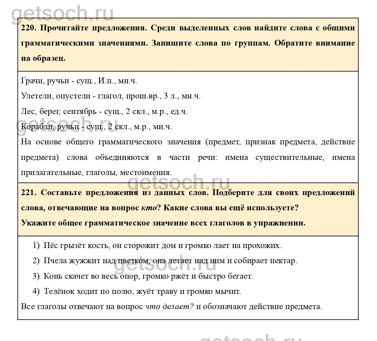 220. Прочитайте предложения. Среди выделенных слов найдите слова с общими грамматическими значениями. Запишите слова по группам. Обратите внимание на образец.
