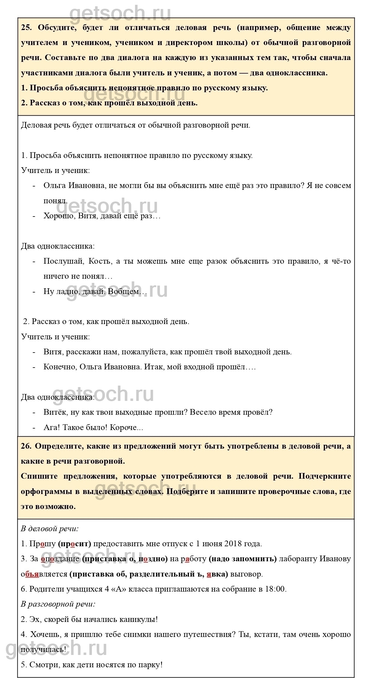 25. Обсудите, будет ли отличаться деловая речь (например, общение между учителем и учеником, учеником и директором школы) от обычной разговорной речи. Составьте по два диалога на каждую из указанных тем так, чтобы сначала участниками диалога были учитель и ученик, а потом — два одноклассника.