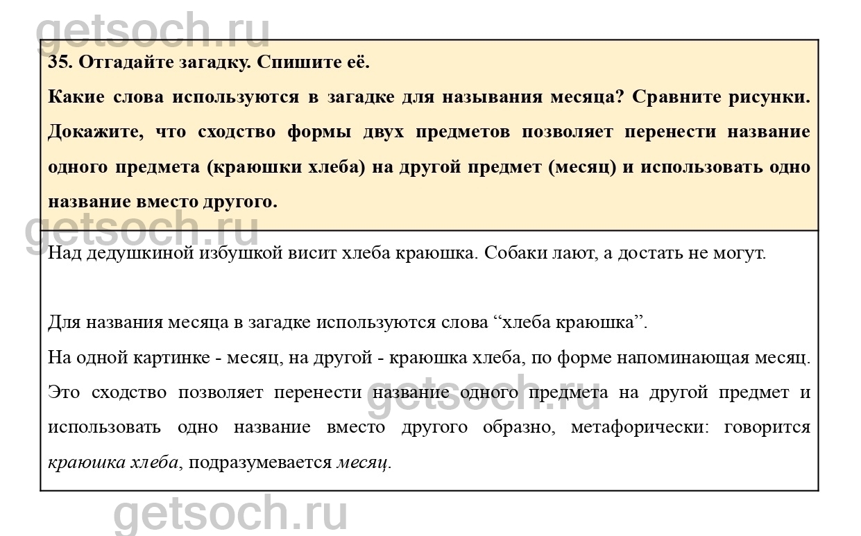 Какие слова используются в загадке для называния месяца? Сравните рисунки. Докажите, что сходство формы двух предметов позволяет перенести название одного предмета (краюшки хлеба) на другой предмет (месяц) и использовать одно название вместо другого.
