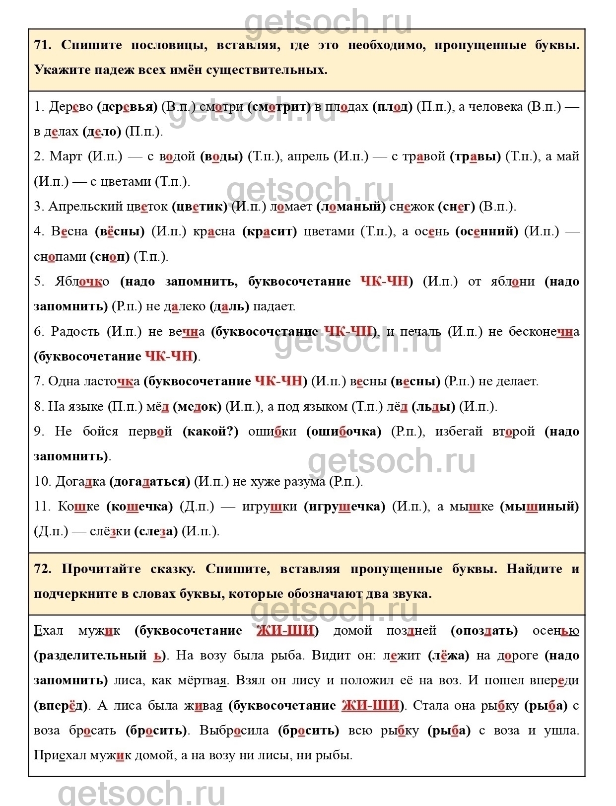 72. Прочитайте сказку. Спишите, вставляя пропущенные буквы. Найдите и подчеркните в словах буквы, которые обозначают два звука.