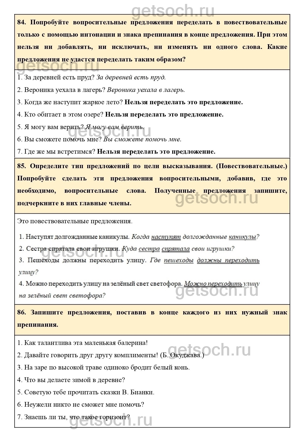 85. Определите тип предложений по цели высказывания. (Повествовательные.) Попробуйте сделать эти предложения вопросительными, добавив, где это необходимо, вопросительные слова. Полученные предложения запишите, подчеркните в них главные члены.