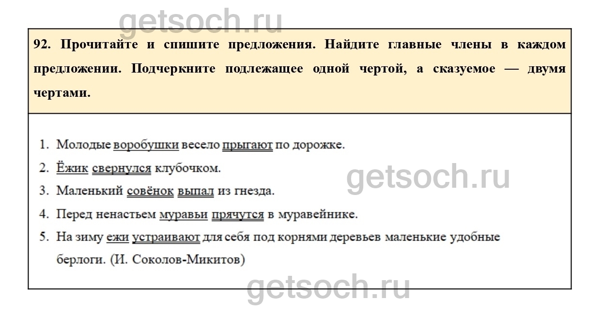 92. Прочитайте и спишите предложения. Найдите главные члены в каждом предложении. Подчеркните подлежащее одной чертой, а сказуемое — двумя чертами.