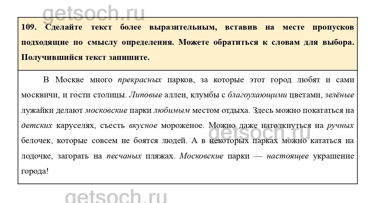109. Сделайте текст более выразительным, вставив на месте пропусков подходящие по смыслу определения. Можете обратиться к словам для выбора. Получившийся текст запишите.