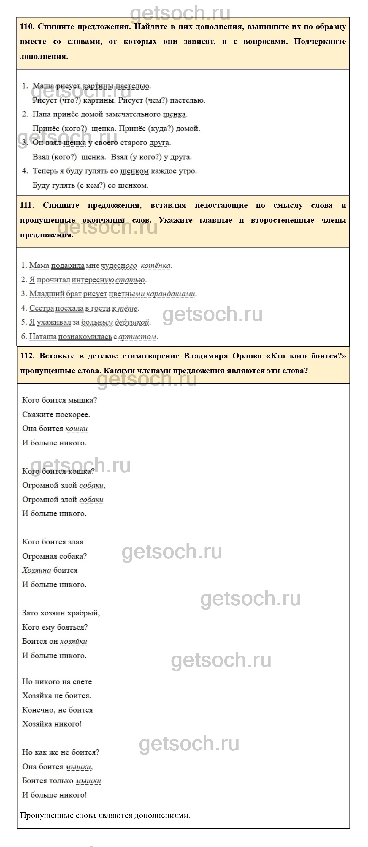 110. Спишите предложения. Найдите в них дополнения, выпишите их по образцу вместе со словами, от которых они зависят, и с вопросами. Подчеркните дополнения.
