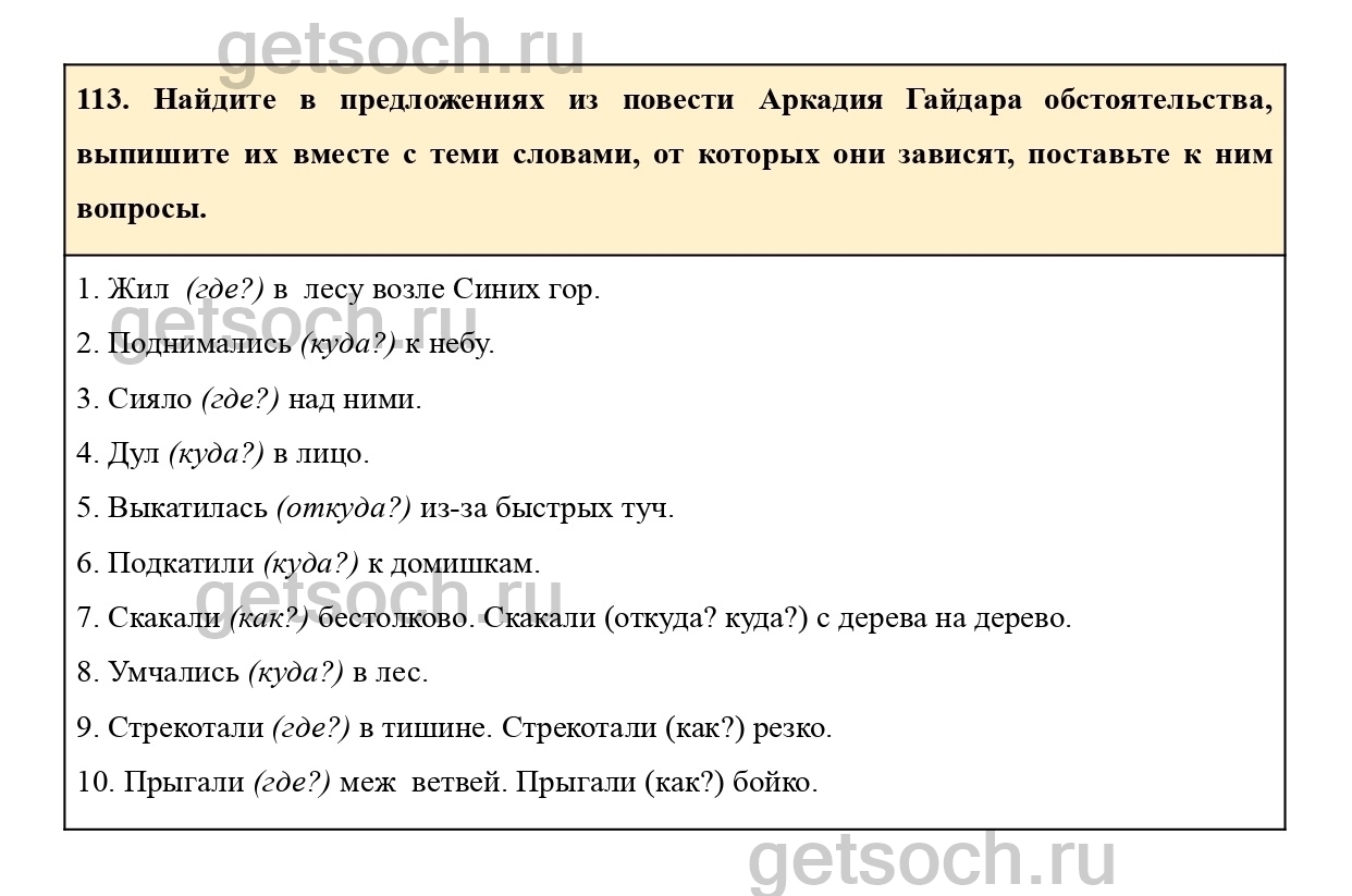 113. Найдите в предложениях из повести Аркадия Гайдара обстоятельства, выпишите их вместе с теми словами, от которых они зависят, поставьте к ним вопросы.