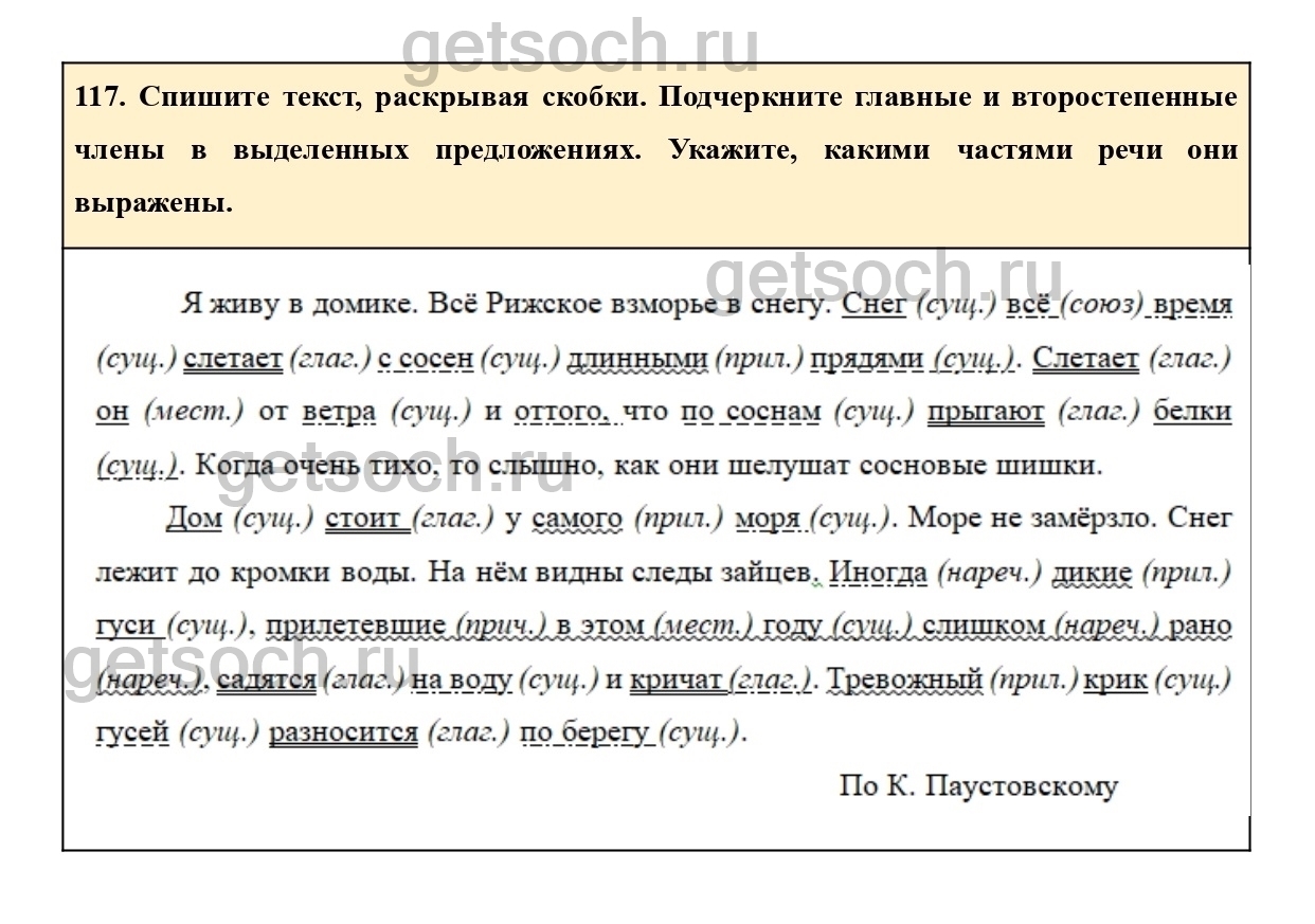 117. Спишите текст, раскрывая скобки. Подчеркните главные и второстепенные члены в выделенных предложениях. Укажите, какими частями речи они выражены.