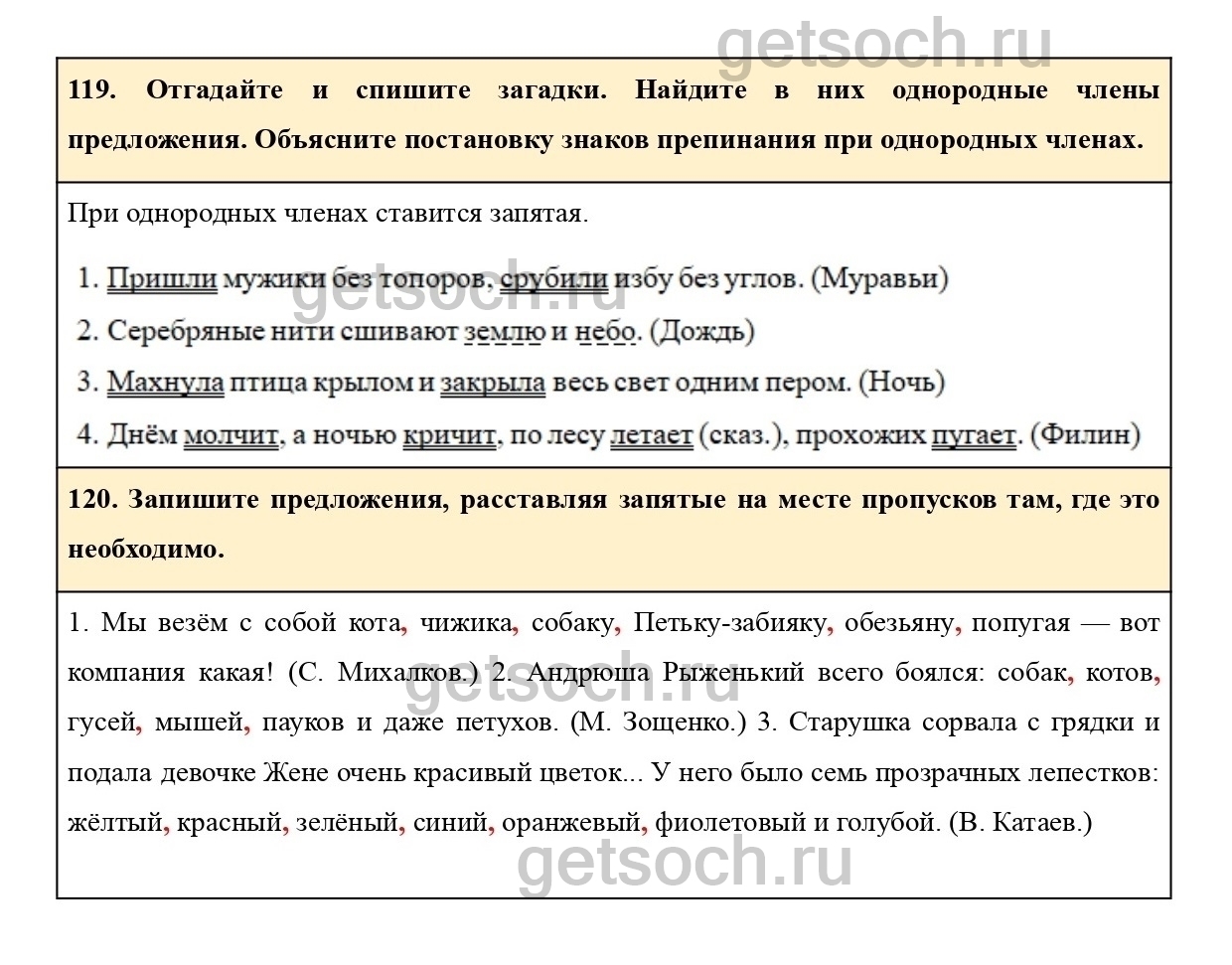 119. Отгадайте и спишите загадки. Найдите в них однородные члены предложения. Объясните постановку знаков препинания при однородных членах.