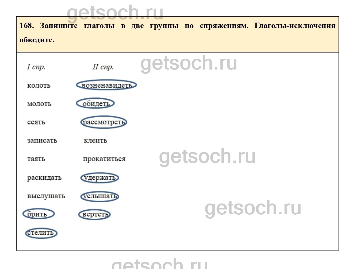 168. Запишите глаголы в две группы по спряжениям. Глаголы-исключения обведите.