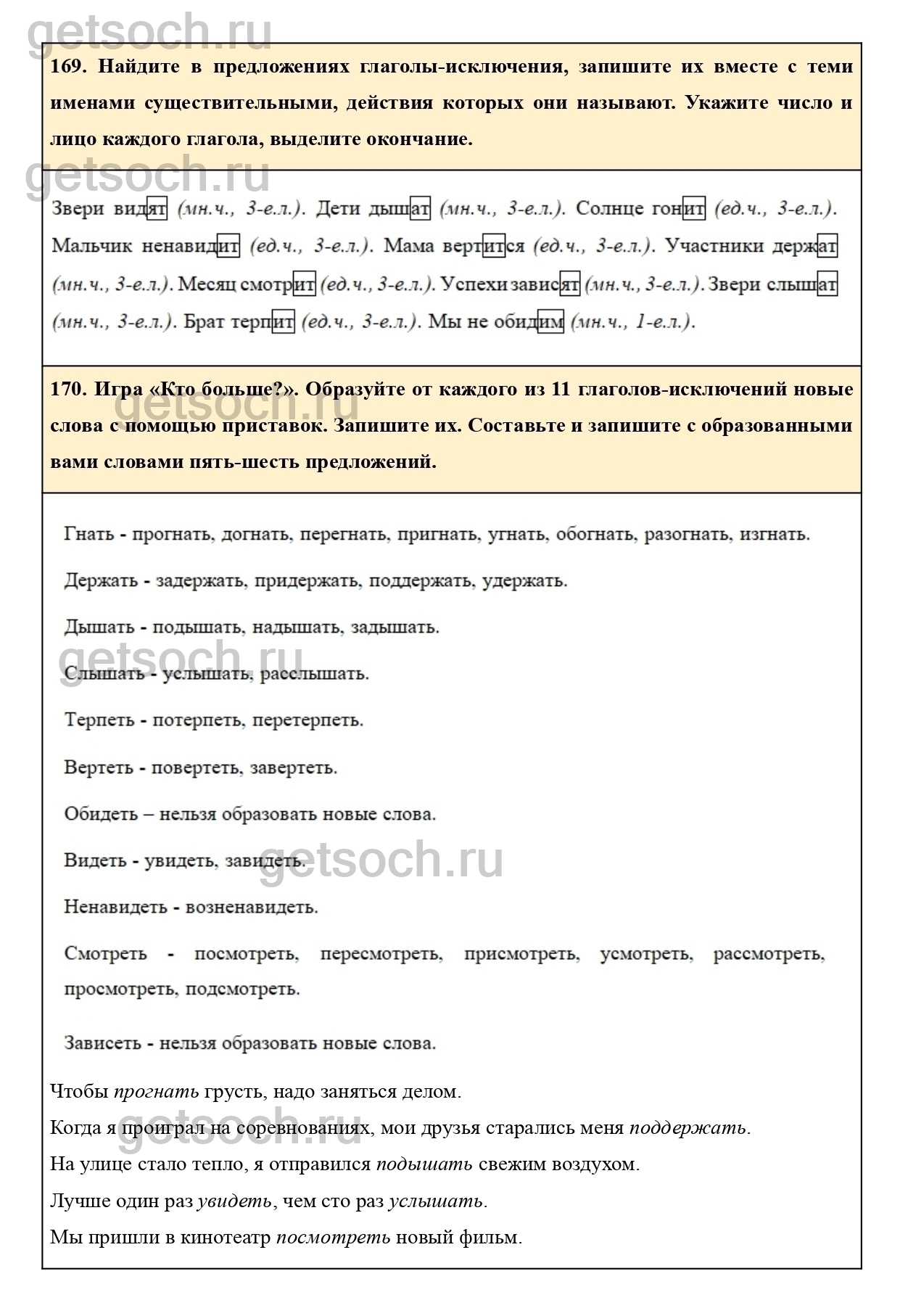 170. Игра «Кто больше?». Образуйте от каждого из 11 глаголов-исключений новые слова с помощью приставок. Запишите их. Составьте и запишите с образованными вами словами пять-шесть предложений.
