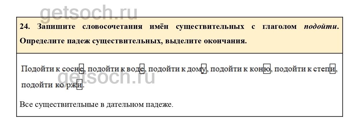 24. Запишите словосочетания имён существительных с глаголом подойти. Определите падеж существительных, выделите окончания.