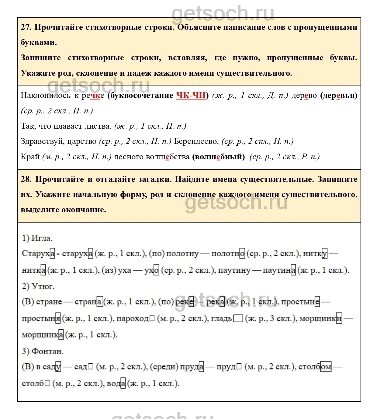 28. Прочитайте и отгадайте загадки. Найдите имена существительные. Запишите их. Укажите начальную форму, род и склонение каждого имени существительного, выделите окончание.