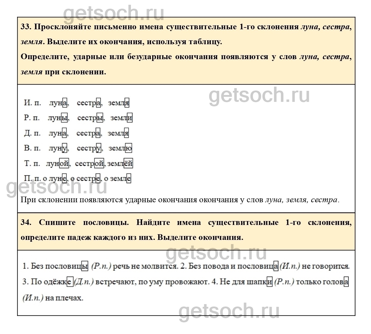 33. Просклоняйте письменно имена существительные 1-го склонения луна, сестра, земля. Выделите их окончания, используя таблицу.