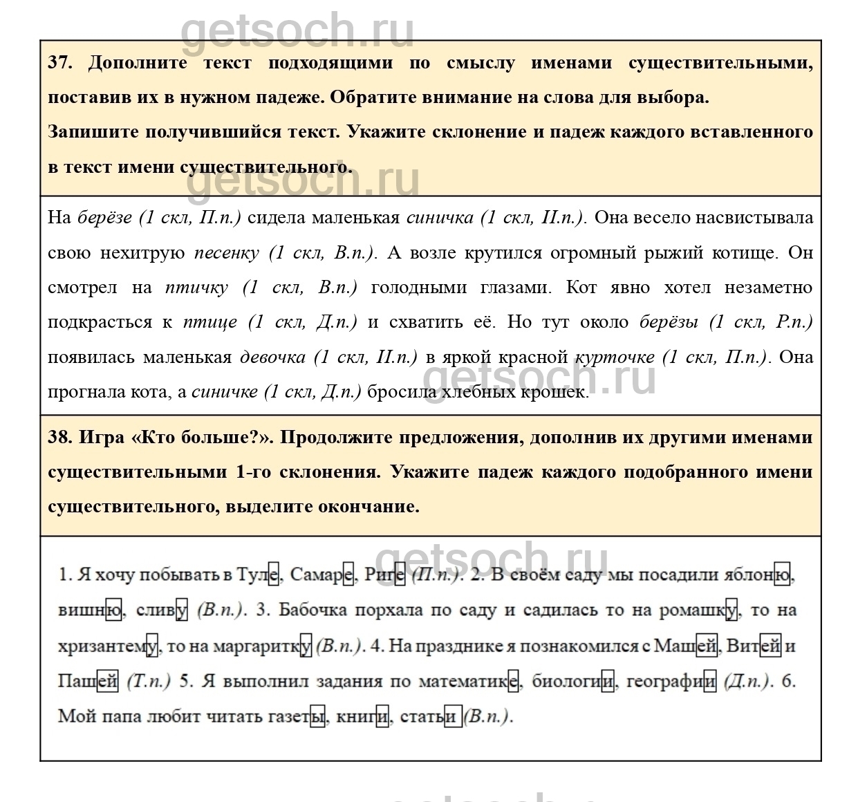 38. Игра «Кто больше?». Продолжите предложения, дополнив их другими именами существительными 1-го склонения. Укажите падеж каждого подобранного имени существительного, выделите окончание.