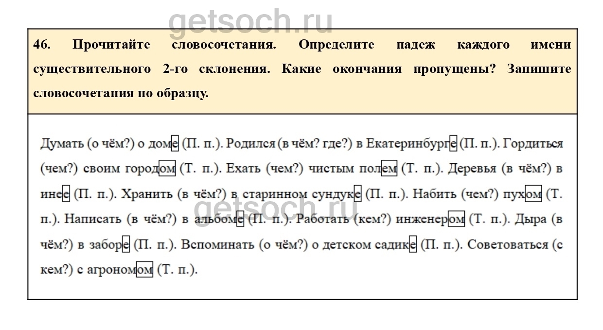 46. Прочитайте словосочетания. Определите падеж каждого имени существительного 2-го склонения. Какие окончания пропущены? Запишите словосочетания по образцу.