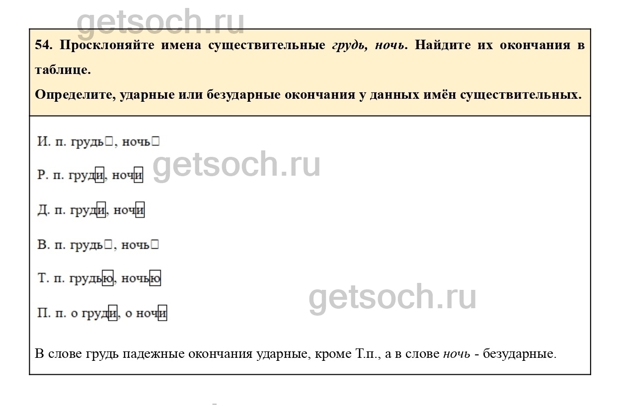 54. Просклоняйте имена существительные грудь, ночь. Найдите их окончания в таблице.