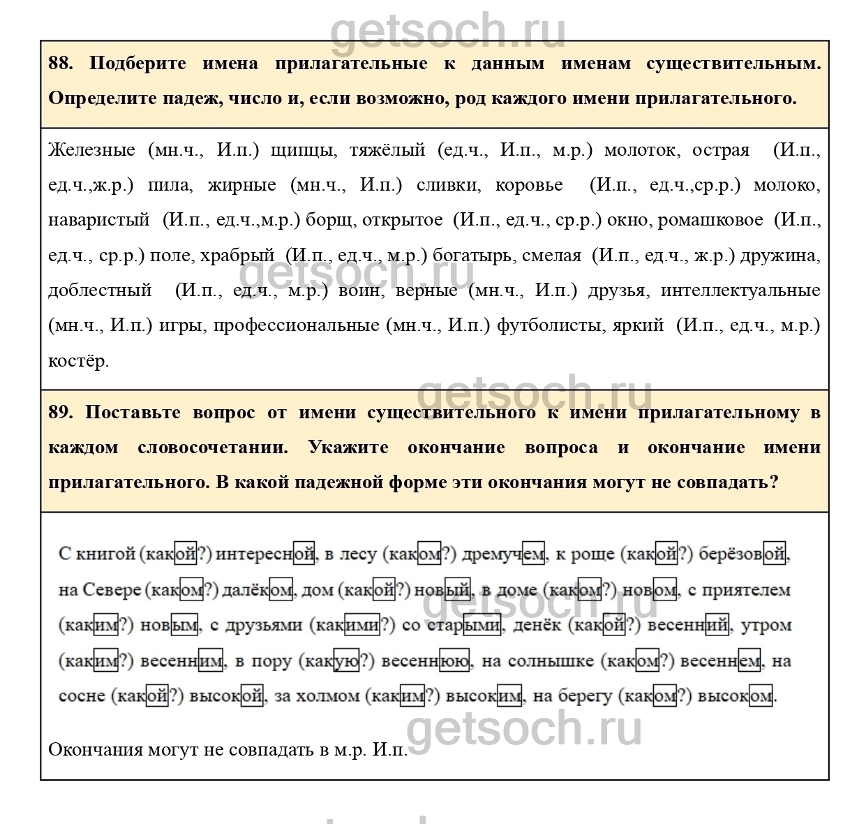 89. Поставьте вопрос от имени существительного к имени прилагательному в каждом словосочетании. Укажите окончание вопроса и окончание имени прилагательного. В какой падежной форме эти окончания могут не совпадать?