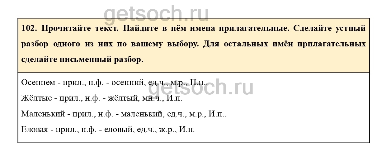 102. Прочитайте текст. Найдите в нём имена прилагательные. Сделайте устный разбор одного из них по вашему выбору. Для остальных имён прилагательных сделайте письменный разбор.